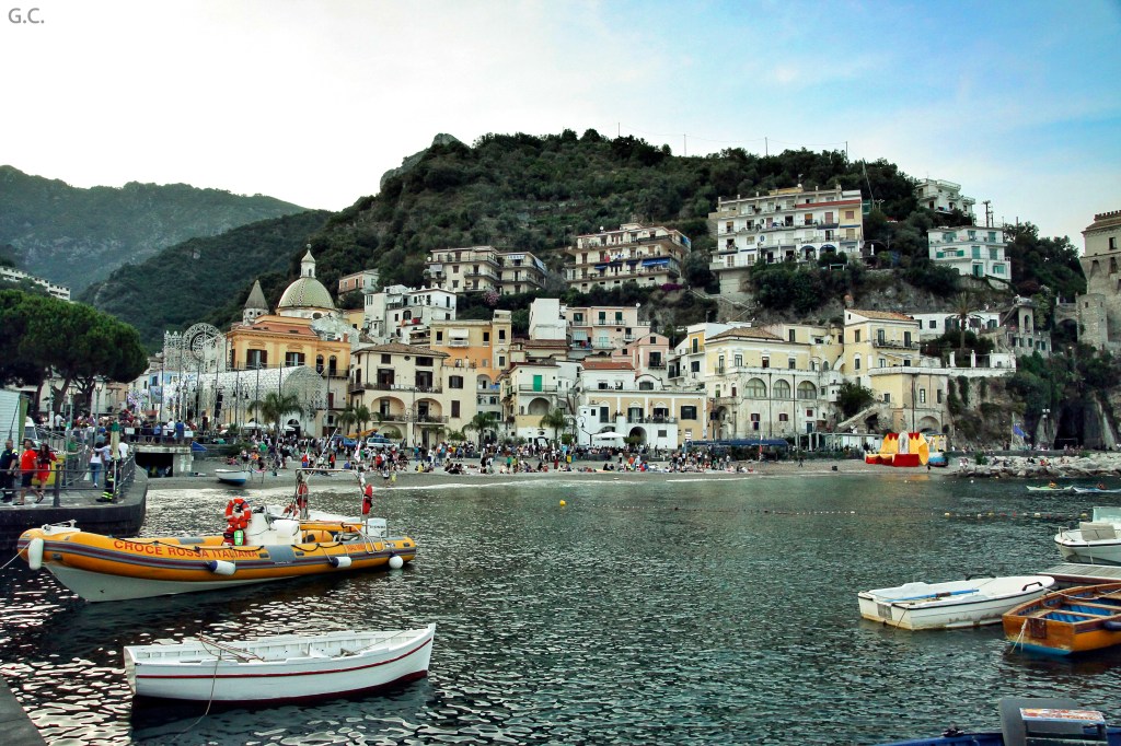 Guardando Cetara dal traghetto, il lido si trova alla fine del paese, sulla destra, subito prima della Torre Vicereale.