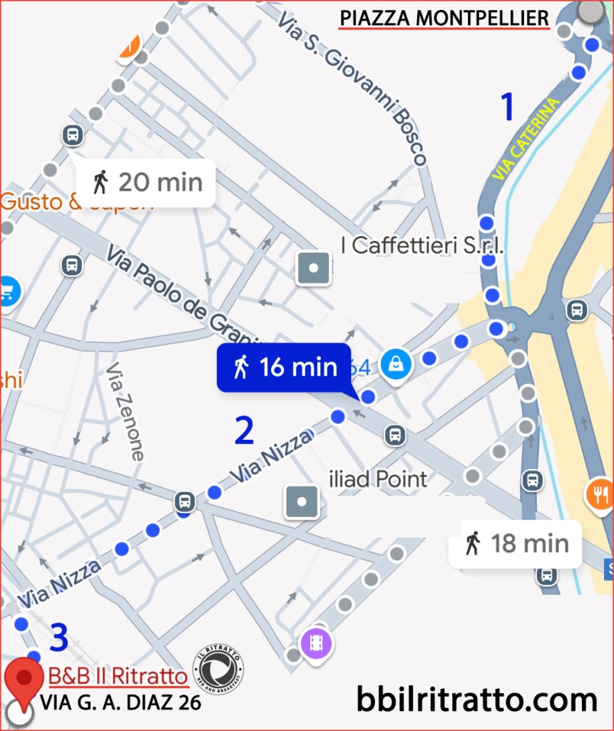 Unfortunately, Piazza Montpellier is far from the center and has no taxis, but the walking route is quite linear, in fact it implies taking only 3 streets, which we have also indicated numerically on the map.
